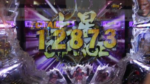 投資10Kの290回転、ケンシロウ保留+「ロゴ落下」+「白」七星ギミック+回想連続疑似連×3+七傷予告+ケンシロウVSラオウ「撃」リーチ+「緑」カットイン→「1」百裂乱舞BONUS当り。