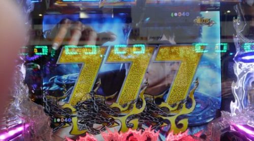 「キリン柄」×2で通常当りは辛い。この時短で何もなければ即ヤメと思い消化していましたら、58回転、「キリン柄」金庫+VS「サウザー」→まさかの「5」→「7」当り。
