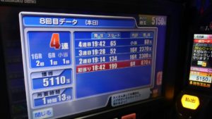 7回転で7連、193回転で6Rの通常当り。117回転で6Rの通常当り。191回転で3連。105回転で2連。計16回当りで86回転の台でした。直近が確変引いて「即落ち」で残念なの台と思われます。