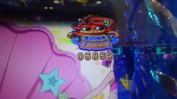 2連目は50回転、「泡」前兆予告×1+「タコ」「ハリセンボン」「カメ」「サメ」「エビ」チャンス目+「ウリンのぶるぶるチャンス」+「サメ」→「エビ」15R確変当たり。