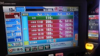 初当たり1回目が、566回転で5連。2回目が188回転で2連。3回目が102回転で5連。4回目が123回転で2連で289回転の台でした。