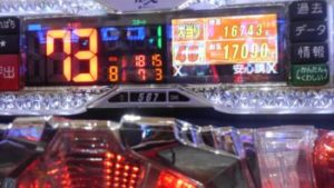 2回目までのデータ表示の撮影を忘れました。初当たり3回目が299回転で8連。4回目が57回転で3連。5回目が169回転で通常当たり。6回目が178回転でして35回転の台でした。