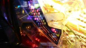 下のの右打ちランプ点灯の写真ですが、左上に大当たりや保留表示7セグランプがあるのですが、再左列がへそ保留の大当たりセグです。