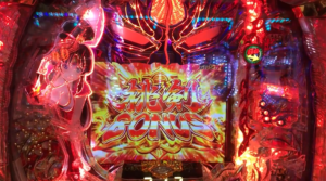 予告は「赤」保留+疑似連×3+鬼顔役物(顔割れ)+「金」系予告+三大激アツリーチで王道あたりですね。