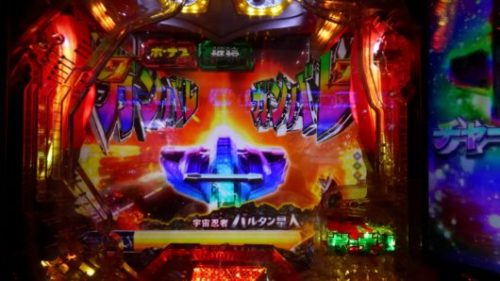 4連目は「7」テンパイ+Pフラッシュ+VSバルタン星人→「7」16R確変当り。