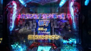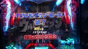 4連目は、VSキングジョー→「負け」2R確変当り。カウントダウンモード50回転で「よみがえるウルトラセブン」「金文字」で「ウルトラセブンRUSH GET」で再突入しました。