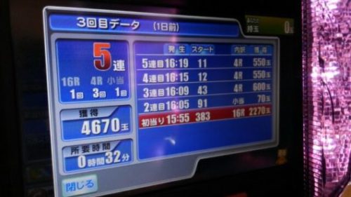 本日、初当りが47回転で7連。2回目の初当りが、325回転で2連。9回当りで306回転の台でした。