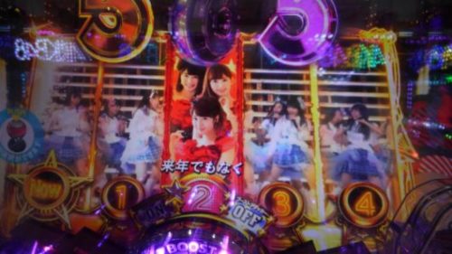 4連目は、12回転で「4」テンパイ「推しメン超絶カットイン」+超絶48フラッシュ+超絶SPリーチ「恋するフォーチュンクッキー」→「4」4R通常当たり?「SPECIAL TIME BONUS」当たり。
