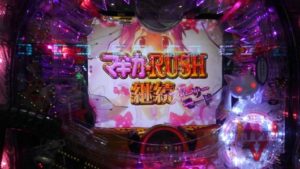 「ワルプルギスの夜」で6回転目に「7」当りして、うまく「マギカ☆RUSH」に突入してくれました。2連目は10回転でキュウベぇを捕まえました。3回転、3連目。3回転「4」連目。1回転「5」連目。4回転「6」連目。5回転「7」連目。