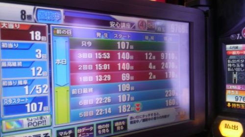 本日、初当たり1回目が、69回転2連。140回転で4連して137回転で空いていました。ヤメた理由がわからない台でした。
