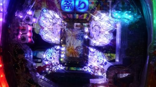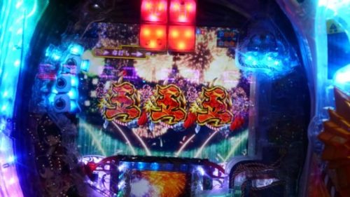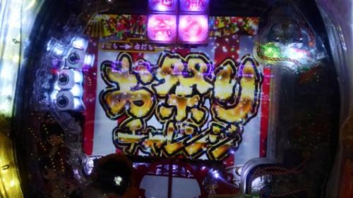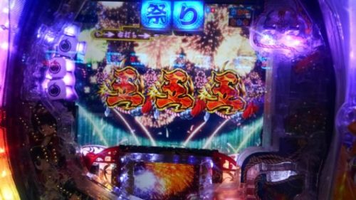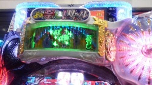 普通に回している「大好機中!?」とどこかで見たことある文字が、液晶に現れました。しばらくすると「右打ち」合図が出たのでて、3R当りでした。電チュー入賞は確変なので、苦労せずに「真・お祭りラッシュ」に入りました。