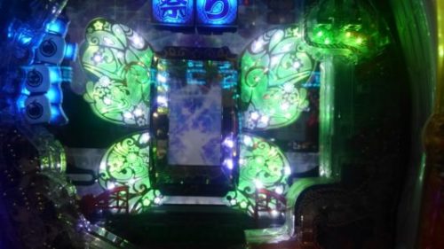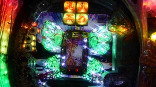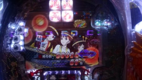 まずは、昨日の実践からです。単発ばかりの22回当りで95回転のの台でした。投資、3Kの141回転、リールが回って疑似連×3+ガラガラから出てきたのは「虹」色玉。