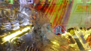 本日、初当りが、779回転で7連、233回転で単発。108回転で空いていた台でした。回すこと130回転、ドライブギア「バイブ」+「赤」保留+疑似連×3+「闘気覚醒」+決戦リーチVS「GOLAN」+ケンシロウ背景「キリン柄」→外れ。