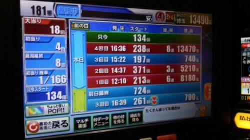 中でも稼働の良い中角台でした。本日、初当りが213回転で6連、371回転で3連。1197回転で単発。232回転で空いていた台でした。