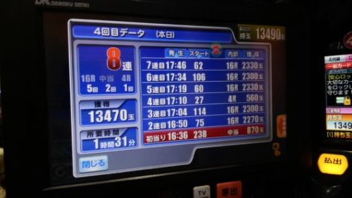 4R×1、6R×1、8R×1、16R×5の上出来な8連でした。ただ爆裂台は、エイリヤン、バジカ星人、PKZ、激引け「レインボー」があるので、そこまで行っていないことも良く分ります。