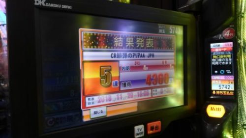 本日の「CR 緋弾のアリア AA」は投資が9.5Kで回収が5742玉の20.4Kで、プラス10.9Kでした。