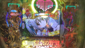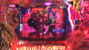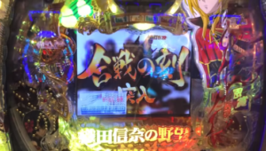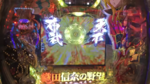 入賞時フラッシュ「赤」+「赤」保留以上+疑似連×3+「金」系予告+「アイキャッチ予告」+「天下布武&家紋回転」+「桶狭間の戦い」リーチで王道当たりです。後は40%の確変を祈るのみです。