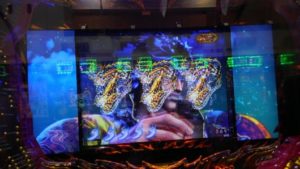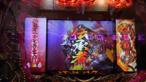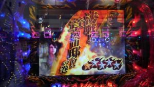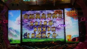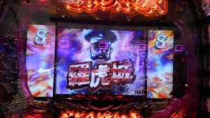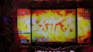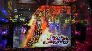 「CR 蒼天の拳 天羅」が空いていたのですぐに座りました。「潜伏確変」3回の後、15回転のたぶん、潜伏確変の台でした。投資、1Kの31回転で、「ロゴ」「赤」点滅+「道士」リーチ「 青幇」当たりで「章烈山」に負けて潜伏確変。