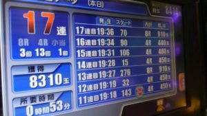 この台で3日前に31連+3連。2日前は12連。昨日は6連+14連して、本日は、3連と17連しました。今日も小勝ちなので、連捷記録を伸ばすため、時短後に即やめました。