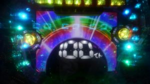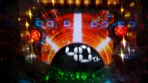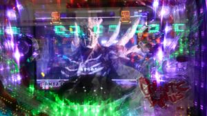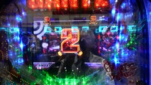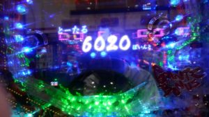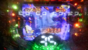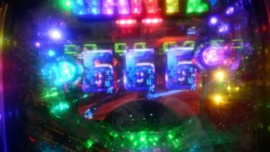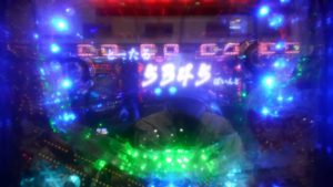 打ち出しから保留変化が頻出し、入賞時フラッシュのX、Y、Zガンの先落ちがよく出るので、当たることを確信して回すこと、57回転目の131回転、保留変化「ちゃんす」でZガンがドーンと落ちました。
