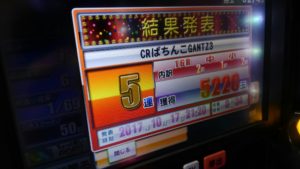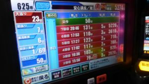 開き直って、「CR.GANTZ」のシマで良さげな台を発見しました。初当りが6回もある台で、最初に6連。次が79回転で3連。103回転で2連。117回転で2連。122回転で2連。110回転で3連で大連チャンはしていないですが、代わりに初当りが軽い甘デジのような台です。74回転で空いていました。