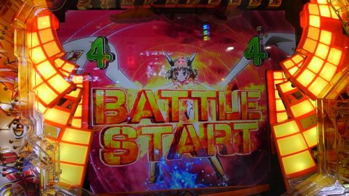 右打ちして2回転でバトルに勝って無事、「シンフォギアチャンス」へ突入しました。通常時のおとなしさとは裏腹に派手な演出です。
