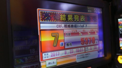 しばらくして「青」保留から疑似連が出だしましたので打っていたら165回転、「赤」保留+楽曲連続予告+Level7+「絶唱演出」+「70億の絶唱リーチ」→「2」当り。出玉が少ししかないので時短を抜けると厳しい感じです。