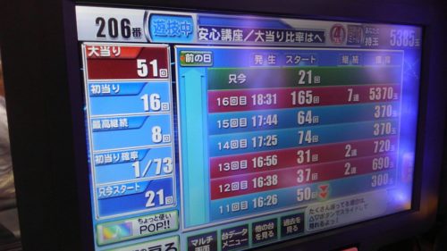 時短後発展することもなく静かになったので20回転でやめました。総投資7Kで回収が5385玉で19.2Kなので+12.2Kでした。