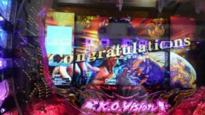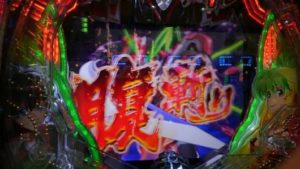 チャンスは時短後すぐに来ました。左打ちして3回転目の107回転、ロゴ「赤」点滅+「WEAPON DRIVE」+「800」+ヒロインリーチ→「伝承者」当り。VS霊王で見事に勝利して、初当り2回目も「蒼拳RUSH」に突入しました。