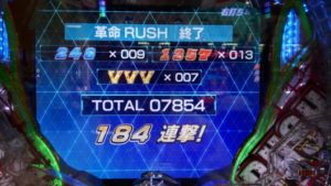 順当に転落なしで考えると11連時がリミットとなります。12連時に「デモ出し」しました。すると100回転後に「革命RUSH」を継続しましたので、11連時はリミットではなかっこちが分かります。