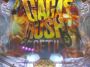 「GAGA RUSH」中は図柄当りと小当たりと外れがあります。「青」図柄当りが小当たりになり、「赤」図柄当りが、確変大当たりでRUSH継続です。特殊図柄は確変or通常当りとなり、「G-CHALLENGE」の突入ラウンド昇格しないと通常背景に戻ります。