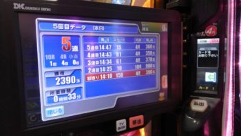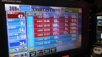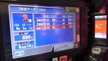本日18回当りで初当たり、1回目が1回転で通常当たり。2回目が46回転で通常当たり。3回目が151回転で12連。4回目が161回転で4連で140回転で空いていた台でした。