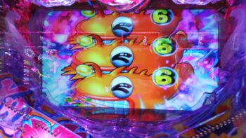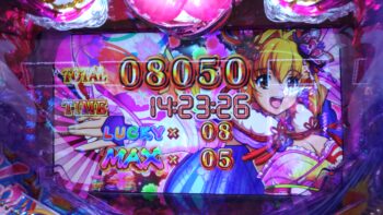 2連目はへそ保留を2個入れての5回転、3R「NEXT LUKY」1回転で3R「LUCKY」当たり。3連目は1回転で3R「LUCKY」当たり。4連目は4回転で3R「LUCKY」当たり。5連目は4回転で3R「LUCKY」当たり。6連目は7回転で3R「LUCKY」当たり。