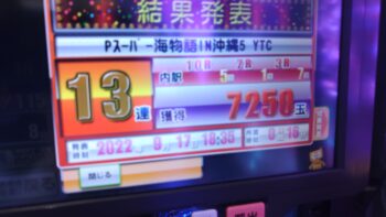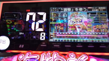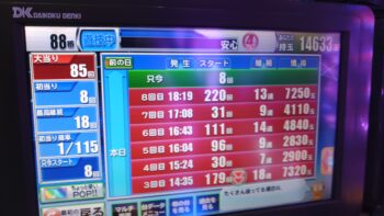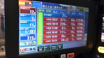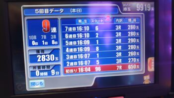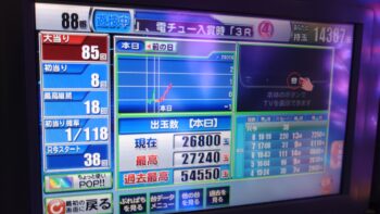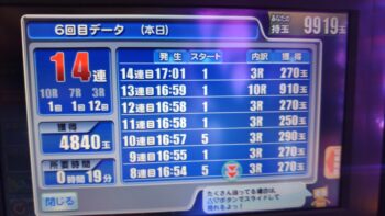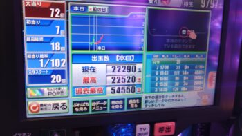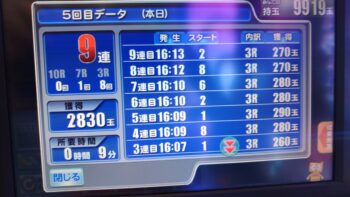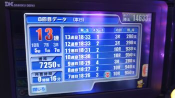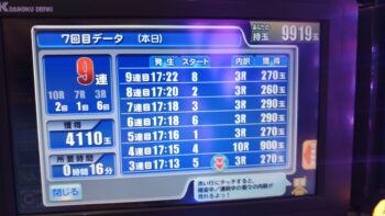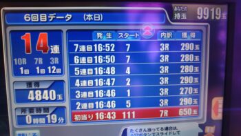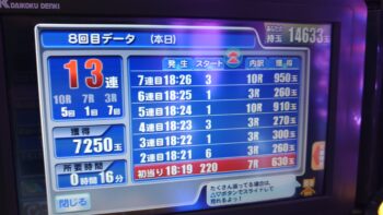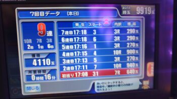 前々日から63回、前日6回で、本日の初当たりは、1回目が152回転で3連、2回目が157回転で12連、3回目が179回転で18連、4回目が30回転で7連、30回転で空いていました。この段階で差玉が2万発を超えている好調台でした。