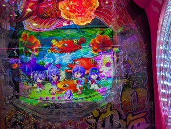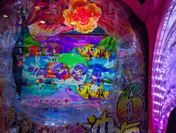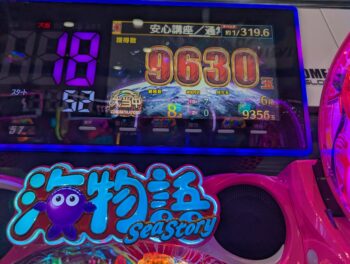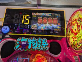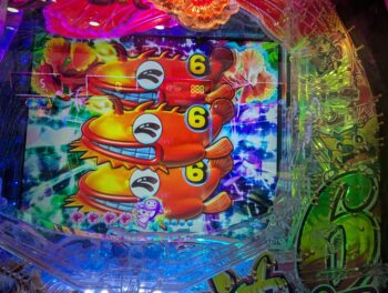 2連目は、潜伏確変中の2回転、「泡」+「タコ」×「カニ」+マリンちゃんリーチ+裏ボタン「カニ」+美らビス「一発告知」⇒「タコ」10R確変当たり。派手な運出なしで当たるのが予想外でした。両隣は驚きでした。自身も当たると思っていても、確変までは不明だったので、決して顔に出さず冷静に喜びました。いやらしい限りです。