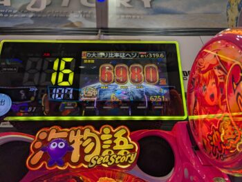 7連目は時短中の先バレ魚群から42回転、クジラッキー保留+魚群+ジンベエあおり+ジンベェ役物+ジンベェSPリーチ⇒「アンコウ」⇒「ジュゴン」10R確変引き戻し当たりでした。