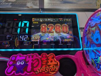 8連目は時短中の52回転、「泡」+センター「サメ」+黒潮リーチ→「サメ」10R通常当たりでした。セグも6連目と同じ通常セグでした。
