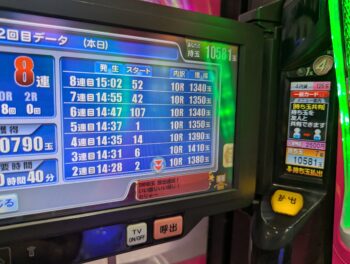 それに当てはまって、初当たり1回目から、10連して、いつものように空いていた台に座りました。いつも言い続けてきましたが、10連以上した台は、誰も座らずに放置されています。