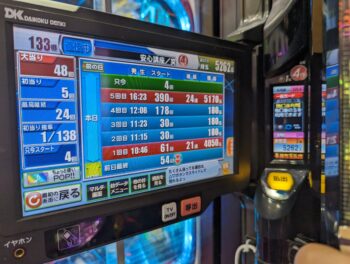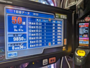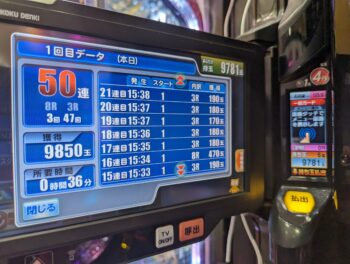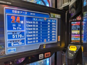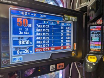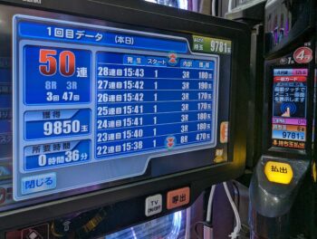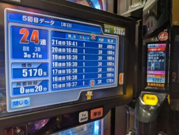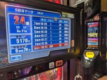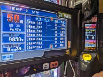 前々日と前日のデータを取り忘れました。本日10月5日の分です。初当たり1回目が61回転で21連。2回目が30回転で通常当たり。3回目も30回転で通常当たり。4回目が178回転で通常当たり、182回転の台でした。