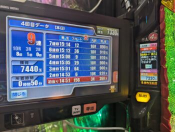 本日の初当たり1回目が、106回転で2連。2回目が、396回転で6連。3回目が、223回転で4連のいわゆる普通の台でした。140回転で空いていました。