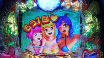 回らない台を頑張って回したのですが、ハンドルから手を放して、トレジャーモードにして打ち出した数回転後、「チャンス目予告」×3➝パールフラッシュ先光り+落下+ステップアップ魚群+「サメ」×「エビ」+マリンちゃんリーチ➝「エビ」10R確変当たりしました。