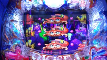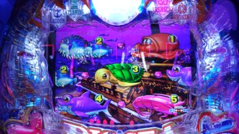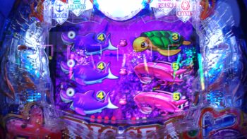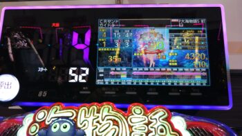 4連目は52回転、左タテ「サメ」+ステップアップ「クラゲ」黒潮リーチ→「サメ」10R通常当たりでした。見慣れた通常セグは「P大海物語5」でも同じでした。.