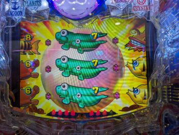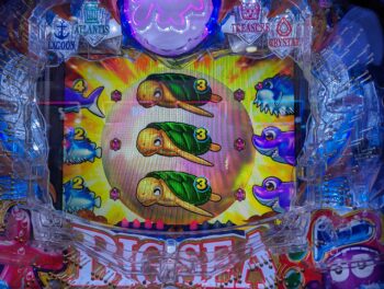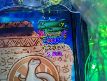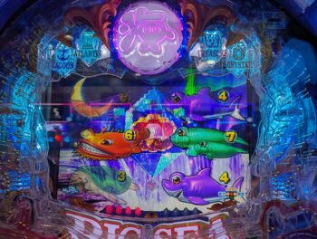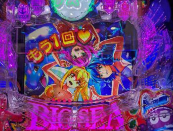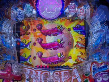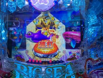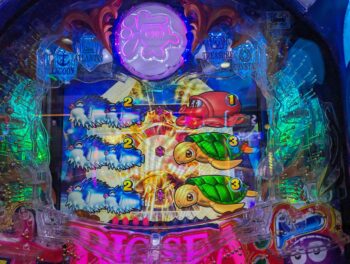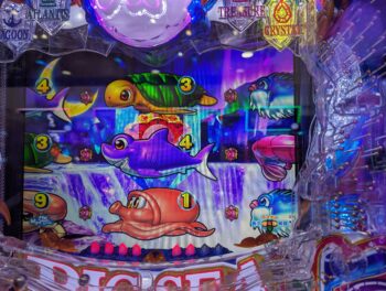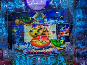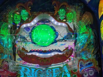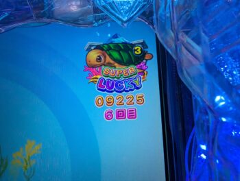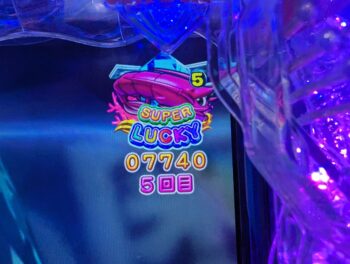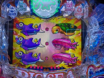 もちろん持ち玉投資の122回転、トイレに行こうと保留を見守っていました。残保留1個目で「泡」前兆なしから、右タテ+クリスタルリーチ+ボタン「連打」+パールフラッシュ「ショート」→「サメ」10R当たりでした。