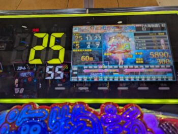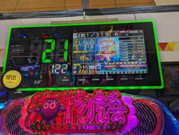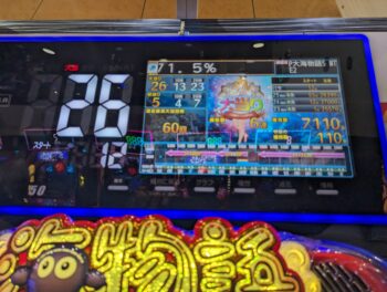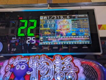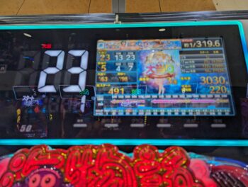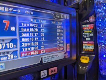 前々日23回、前日13回当たりで、本日の初当たりが、1回目が18回転で7連。2回目が282回転で9連。3回目が162回転で単発。216回転で空いていました。この時点で出玉が25500発以上の台でした。