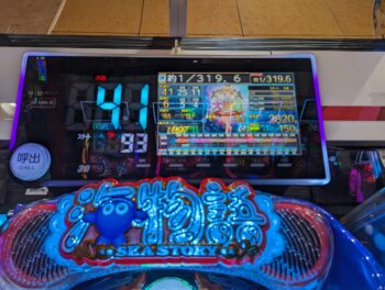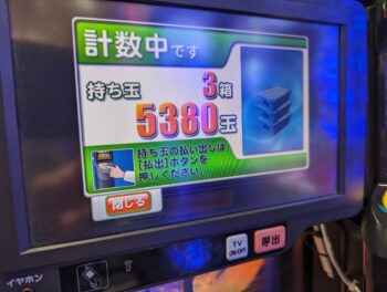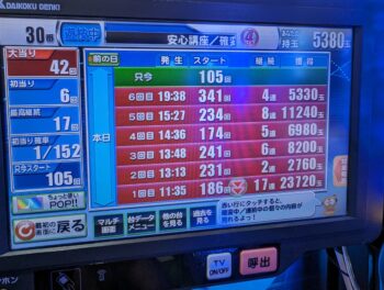 前々日11回、前日25回当たりで、本日の初当たりが、1回目が186回転で17連。2回目が231回転で2連。3回目が241回転で6連。4回目が、174回転で5連。5回目が234回転で8連。338回転でいつものように空いていました。この時点で出玉が5万7千発以上で差玉でも4万4千発の爆発台でした。