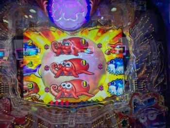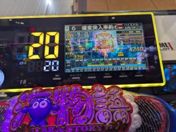 4連目は20回転、前兆なし+右タテ「タコ」ノーマルリーチ+通り過ぎ+魚群→「タコ」10R確変当たりでした。