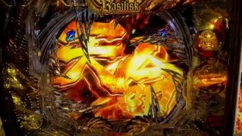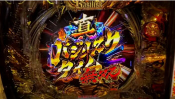 「真瞳術RUSH」終了後は10R大当たりを消化したのち、メインRUSHにあたる「真バジリスクタイム」(継続率約85%)へ移行します。