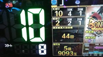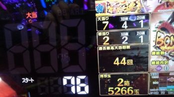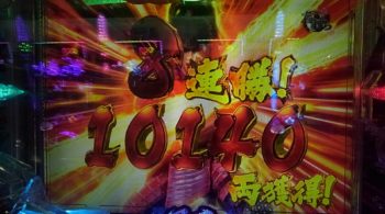 10連目は、60回転、「7」テンパイ+奥村助右ヱ門+傾奇御免」ギミック→「7」「天晴」10R当たり。