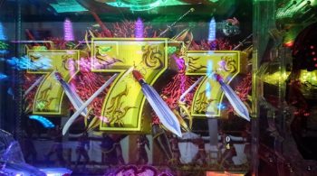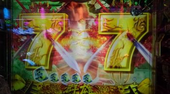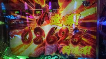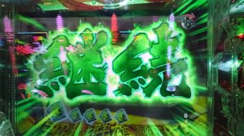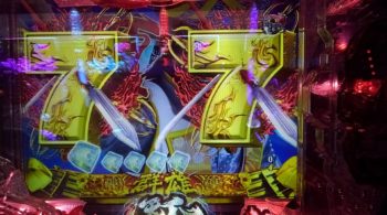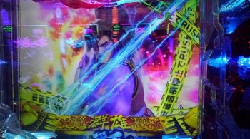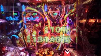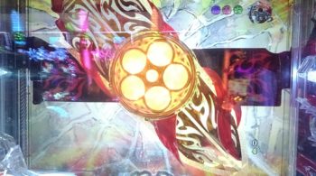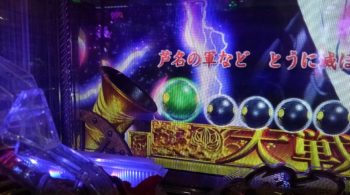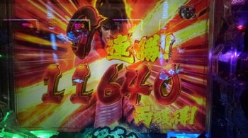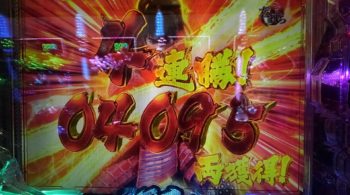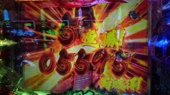 5連目は、140回転、「赤」軍負け演出+朱槍ギミック+復活城門突破→「七」10R当たりでした。