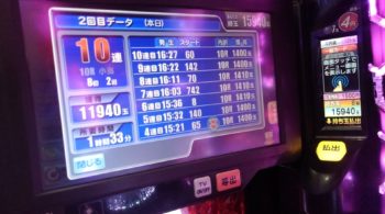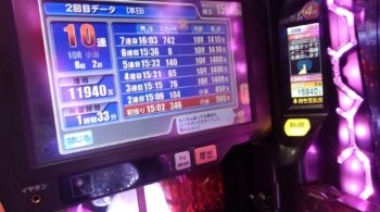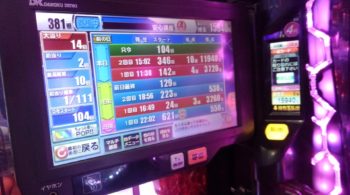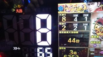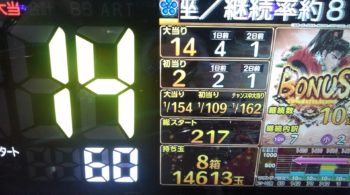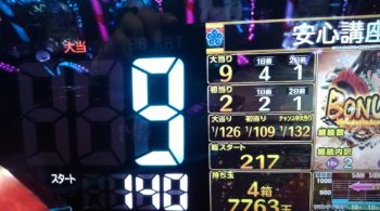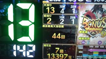 本日、初当たりが142回転で、4連してて338回転で空いていました。